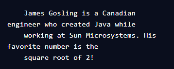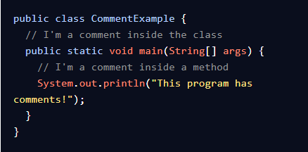 Comments are different from printing to the screen, when we use System.out.println(). These comments won’t show up in our terminal, they’re only for people who read our code in the text editor. | 주석은 System.out.println()을 사용할때 화면에 출력되는 것이 다릅니다. 이 주석은 터미널에서 출력 되지 않으며 텍스트 에디터에서 코드를 읽는 사람들을 위한 것 입니다. |