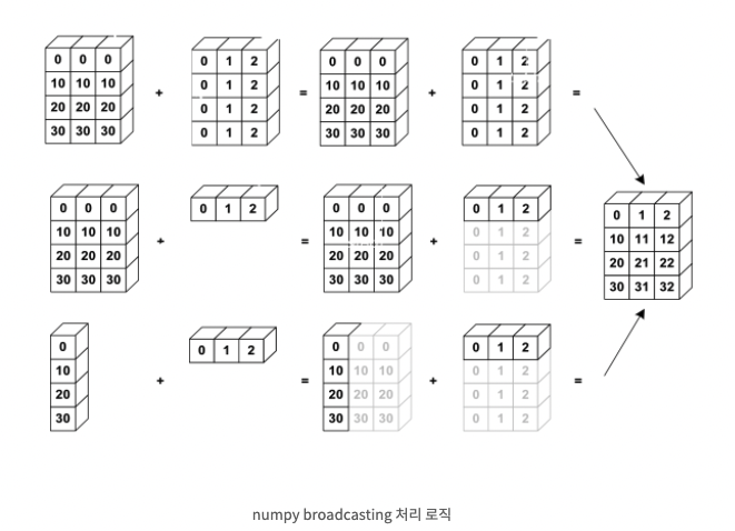NumPy가 자동으로 크기를 확장해서 연산이 가능하도록 해주는 기능.
